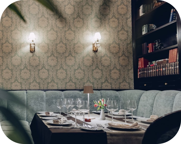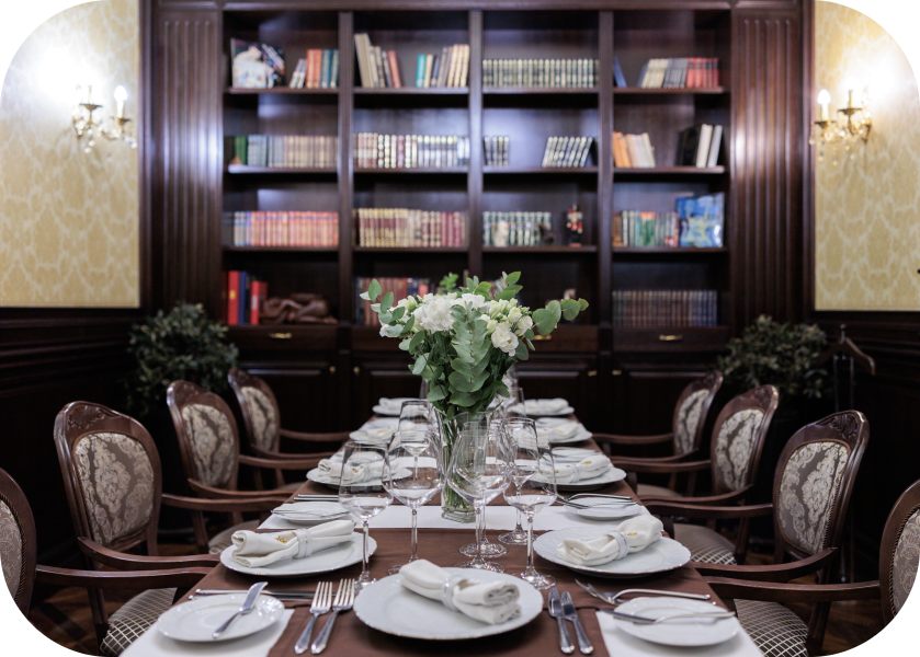 Площадь зала: 50 м2 Вместимость: до 15 гостей банкетом